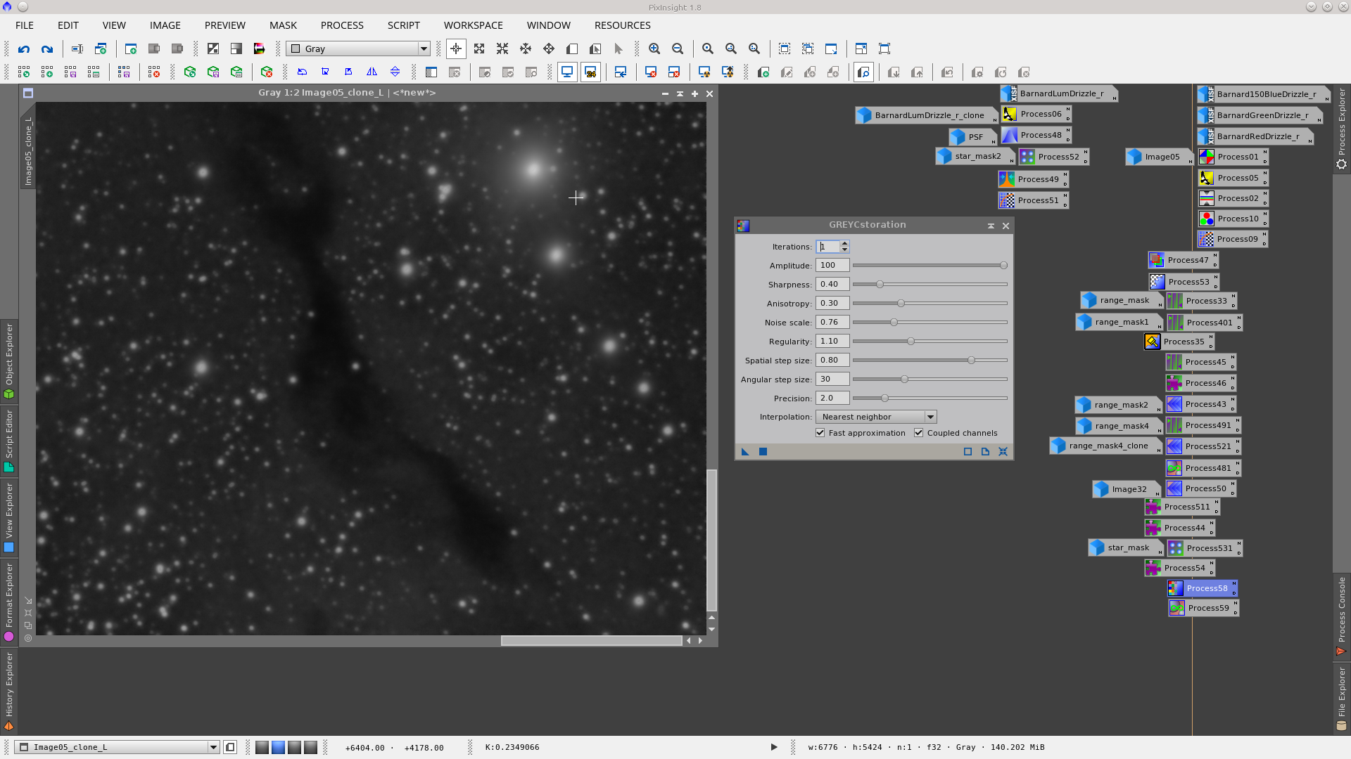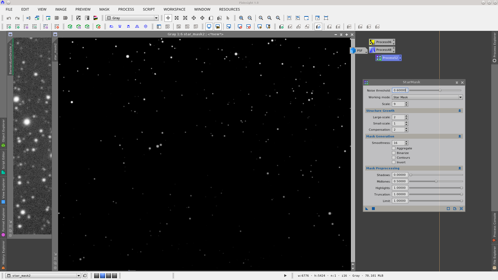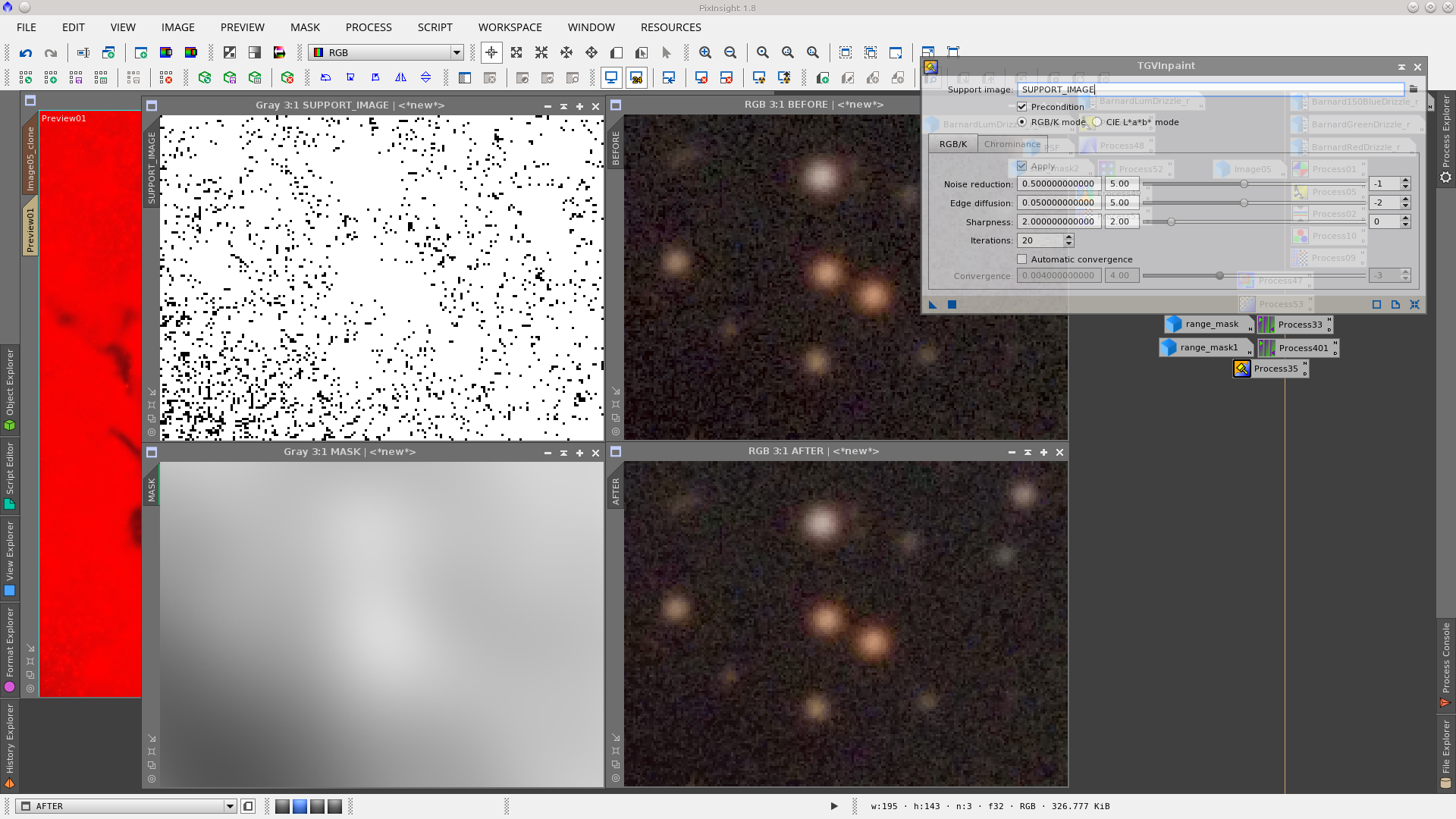 Next step is the correction of dark pixels in the background using TGVInpaint tool. This step is useful to make it easier then to reduce noise. Generate a mask that represent the pixels to be corrected using RangeSelection tool, with the same parameters but with a little smoothness generate another RangeMask that will be used protecting the starts and bright object. Finally in TGVInpaint tool select the corresponding support image (the first mask) and apply it. See Before and After of dark pixels correction.