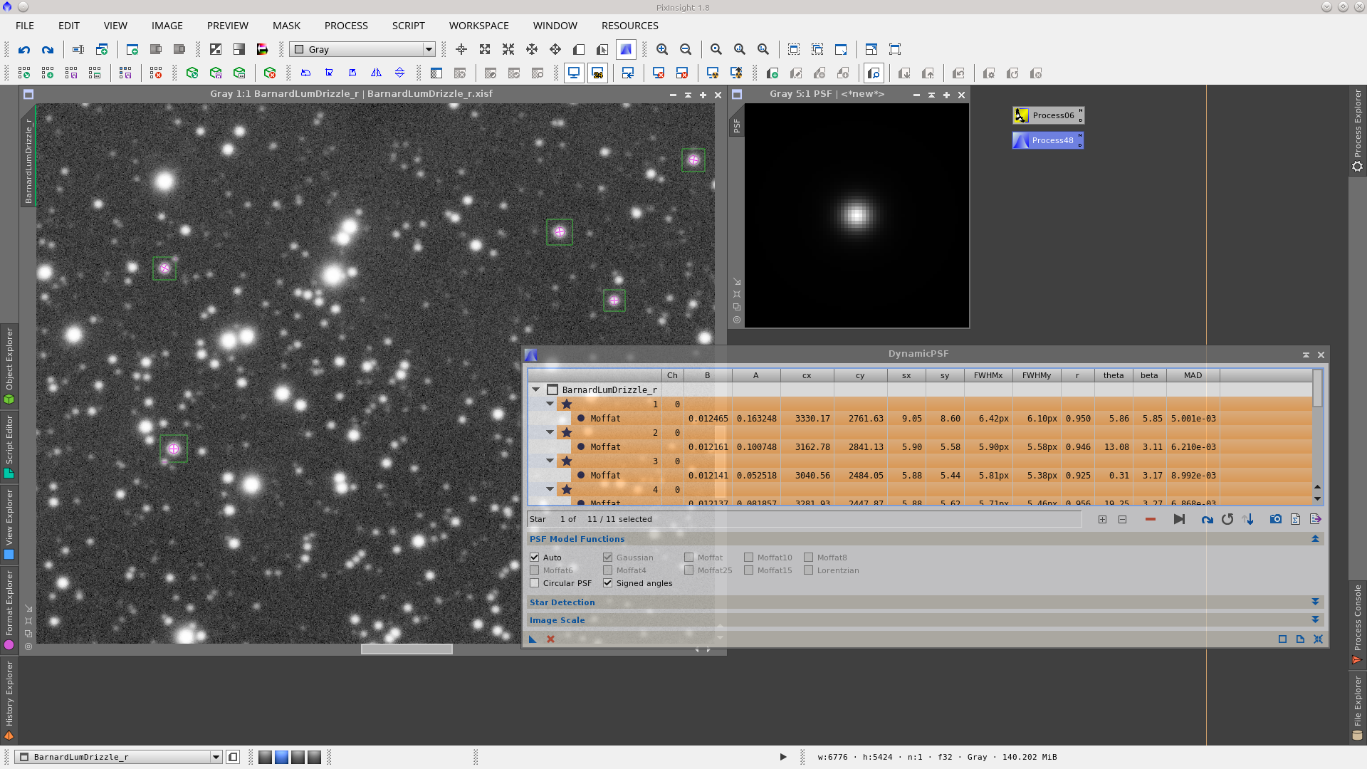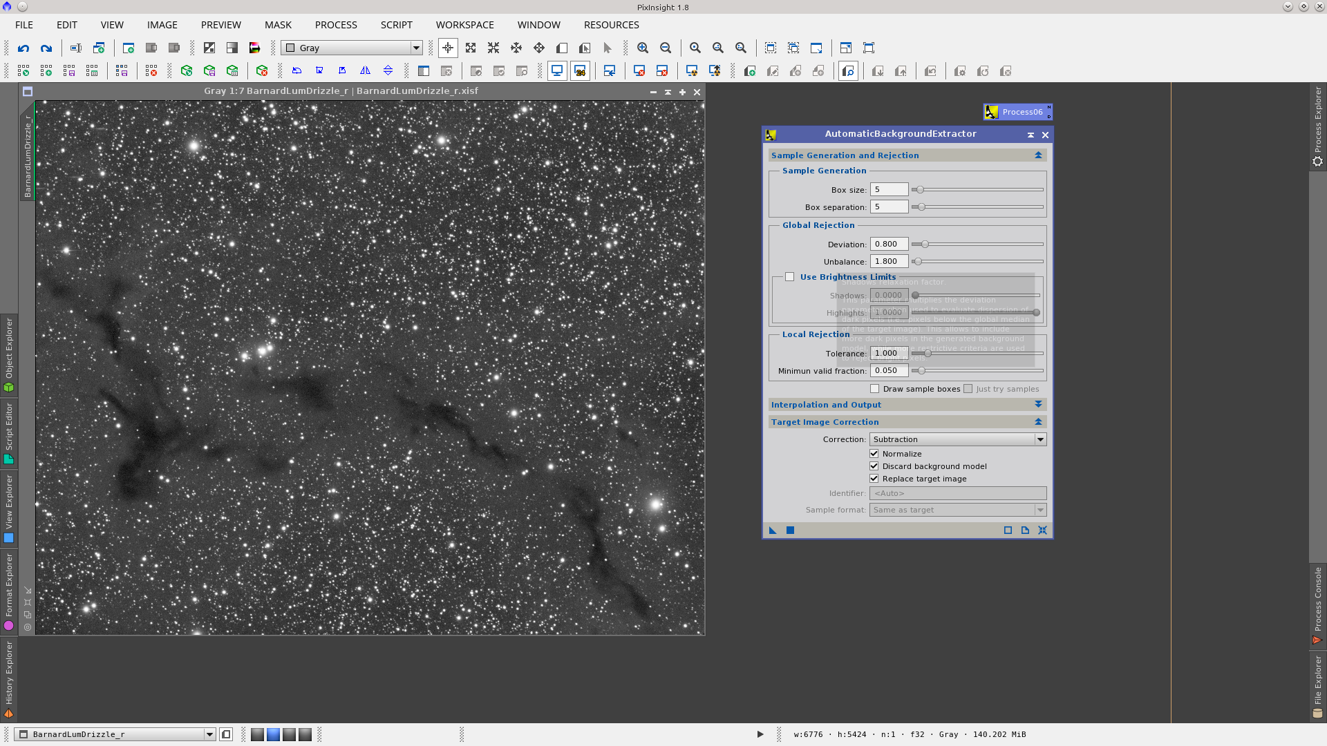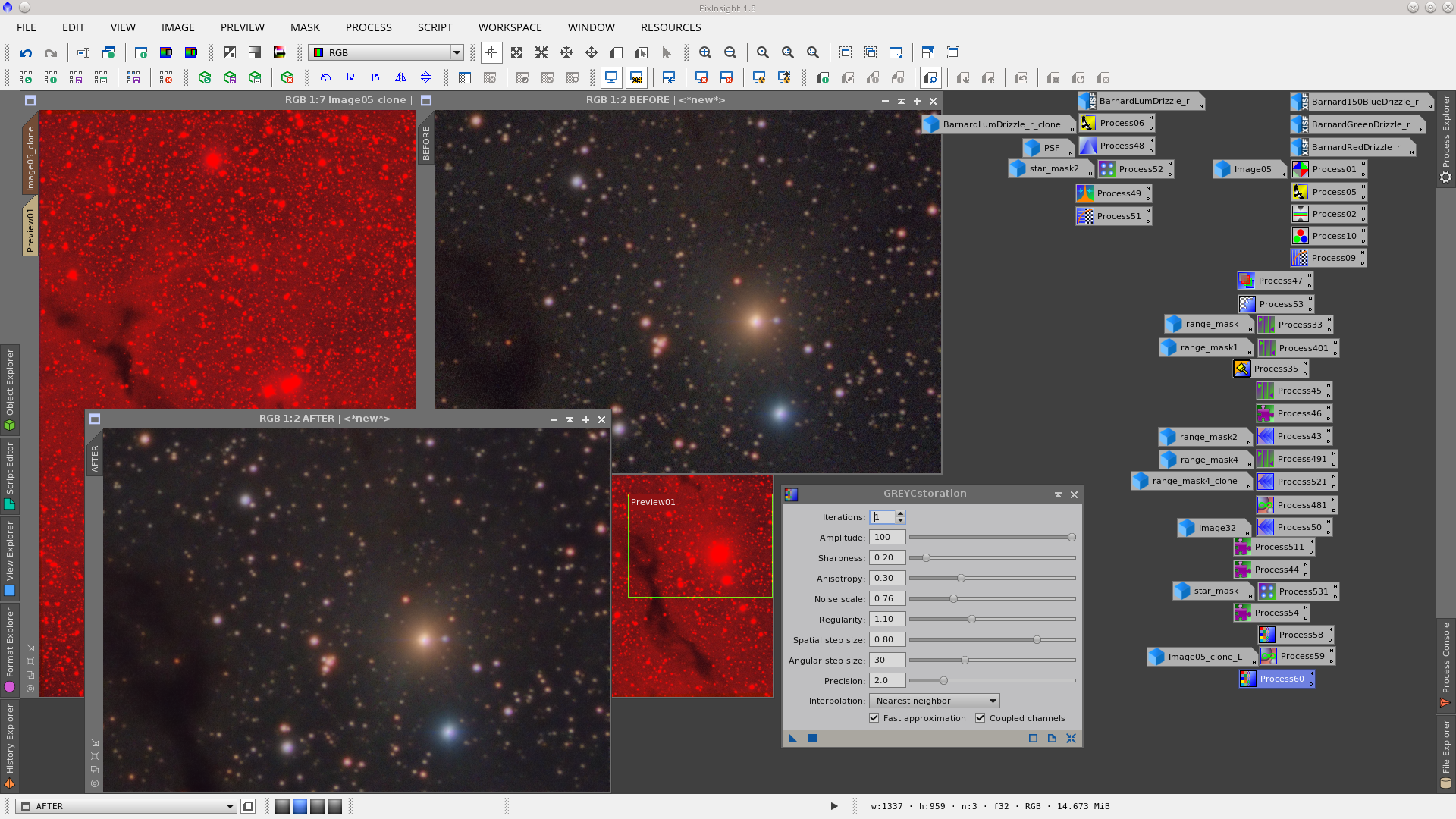 Next step is the correction of dark pixels in the background using TGVInpaint tool. This step is useful to make it easier then to reduce noise. Generate a mask that represent the pixels to be corrected using RangeSelection tool, with the same parameters but with a little smoothness generate another RangeMask that will be used protecting the starts and bright object. Finally in TGVInpaint tool select the corresponding support image (the first mask) and apply it. See Before and After of dark pixels correction.