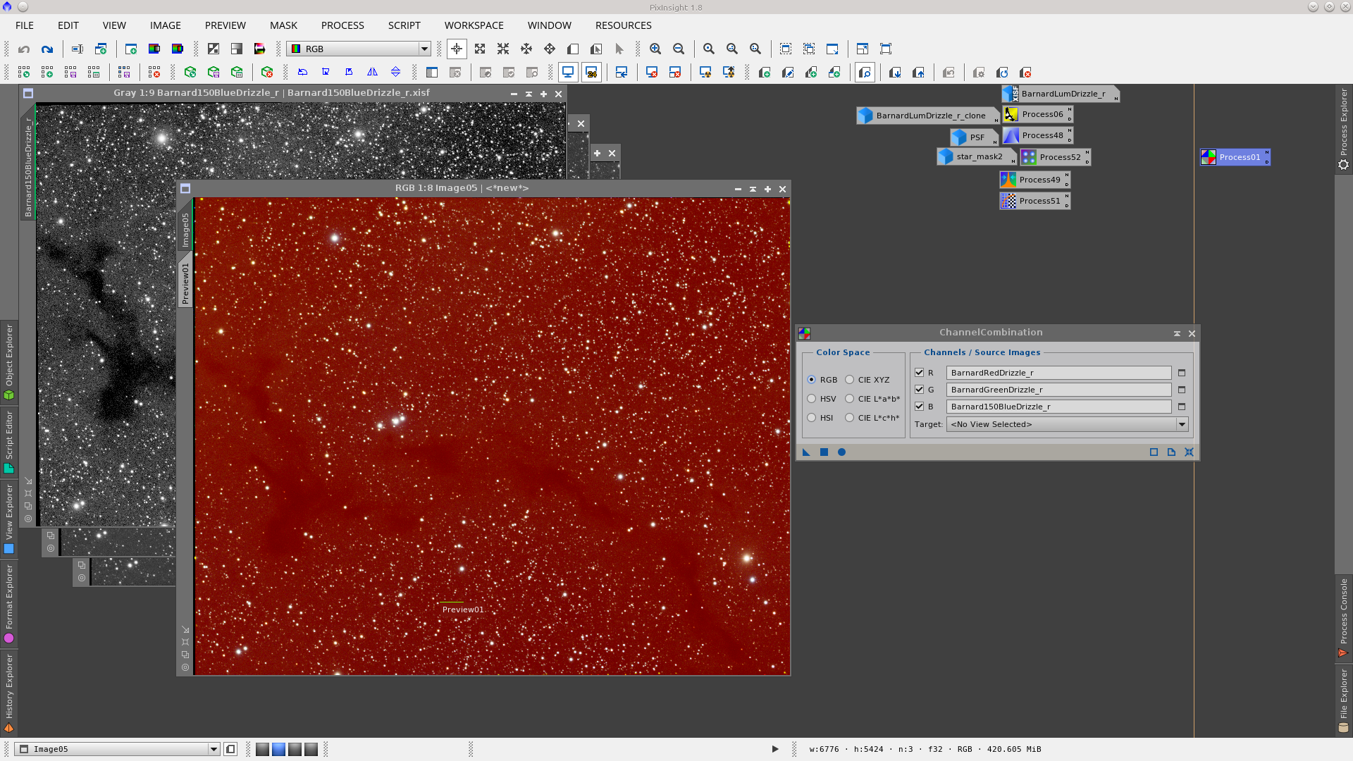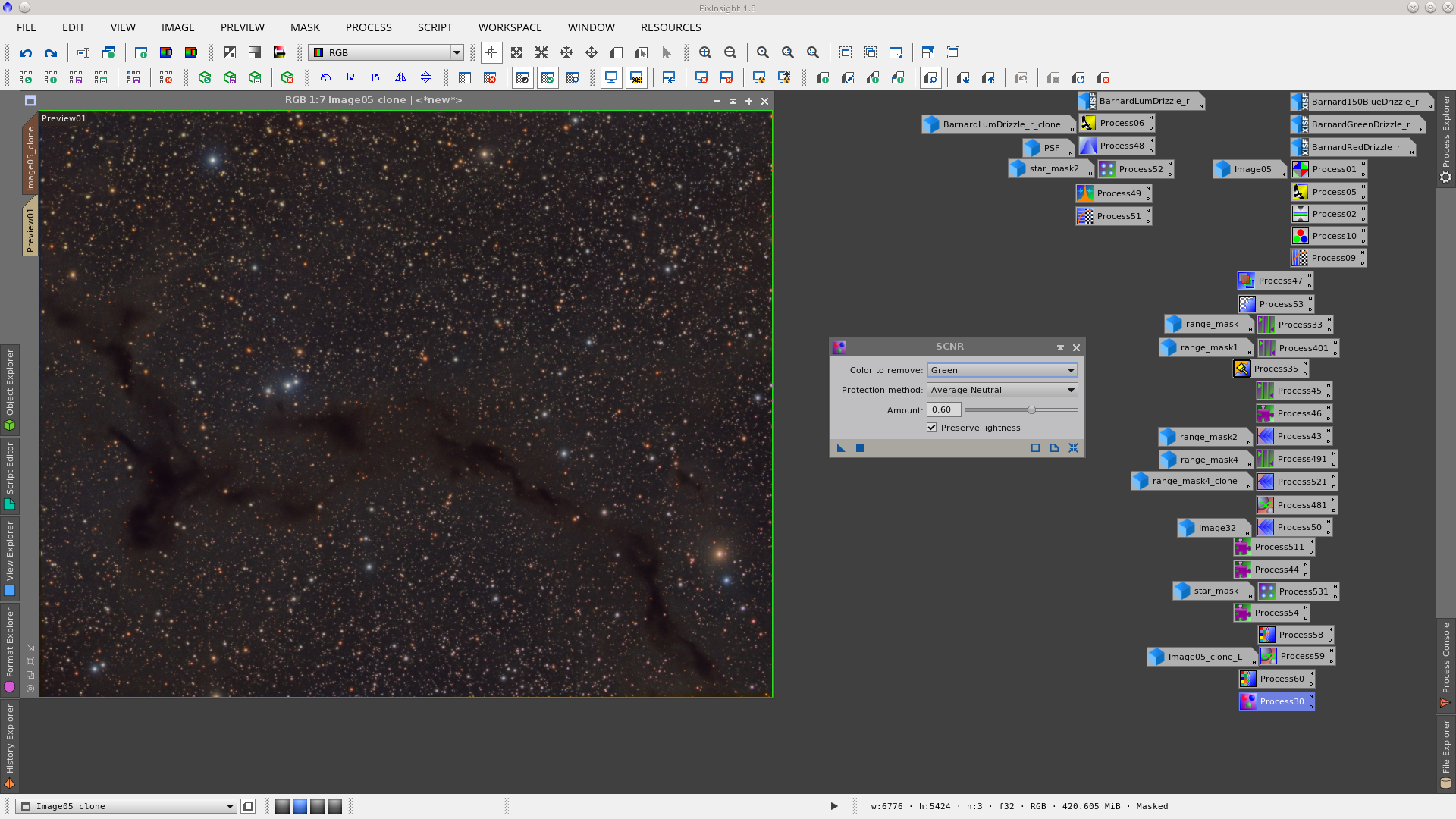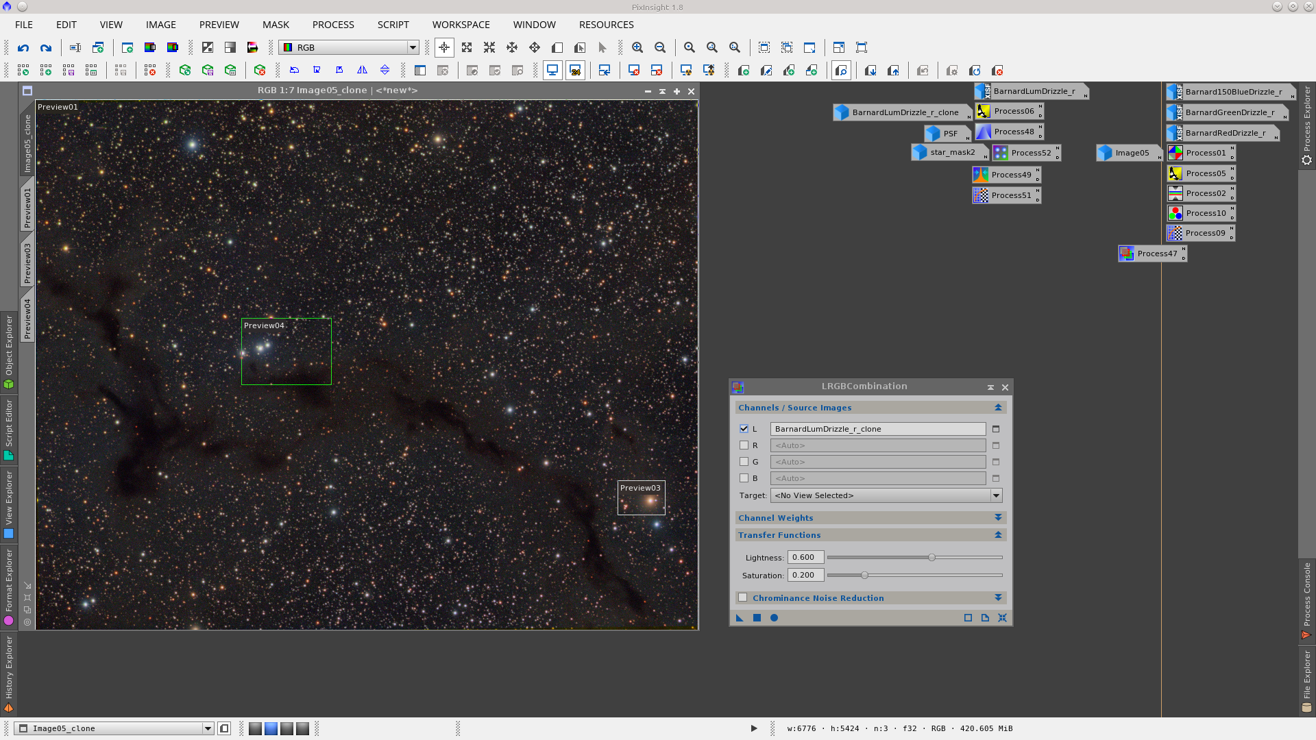 Image of vkohli publicated in General - They were provided the integrated L, R, G and B frames of a Dark nebula image - Main notes: AutomaticBackgroundExtractor to remove gradients, TGVInpaint to help noise reducition and MorphologicalTransformation to reduce stars. Date: August 2016