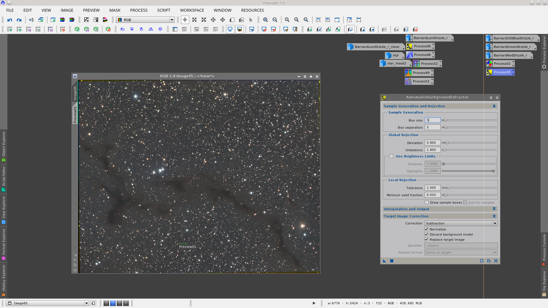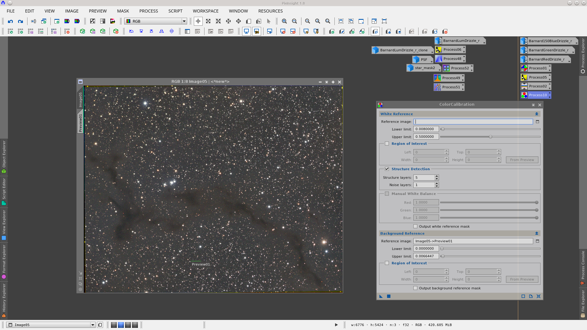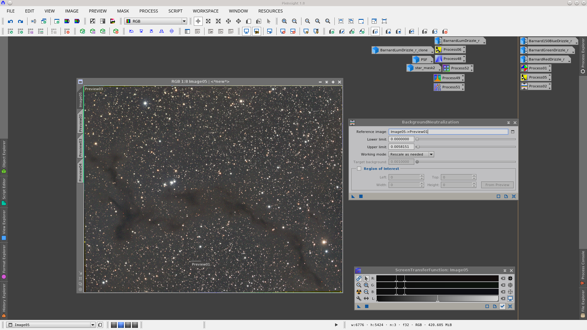 Image of vkohli publicated in General - They were provided the integrated L, R, G and B frames of a Dark nebula image - Main notes: AutomaticBackgroundExtractor to remove gradients, TGVInpaint to help noise reducition and MorphologicalTransformation to reduce stars. Date: August 2016