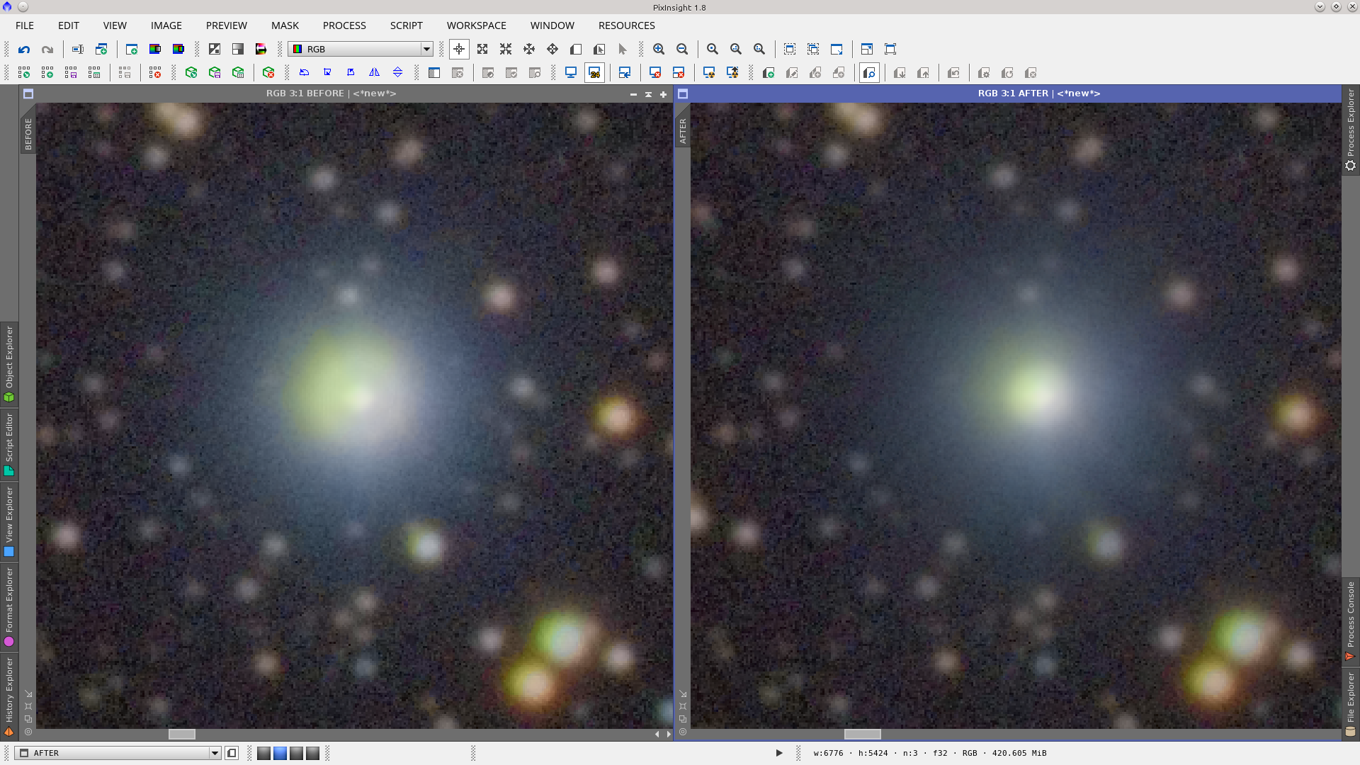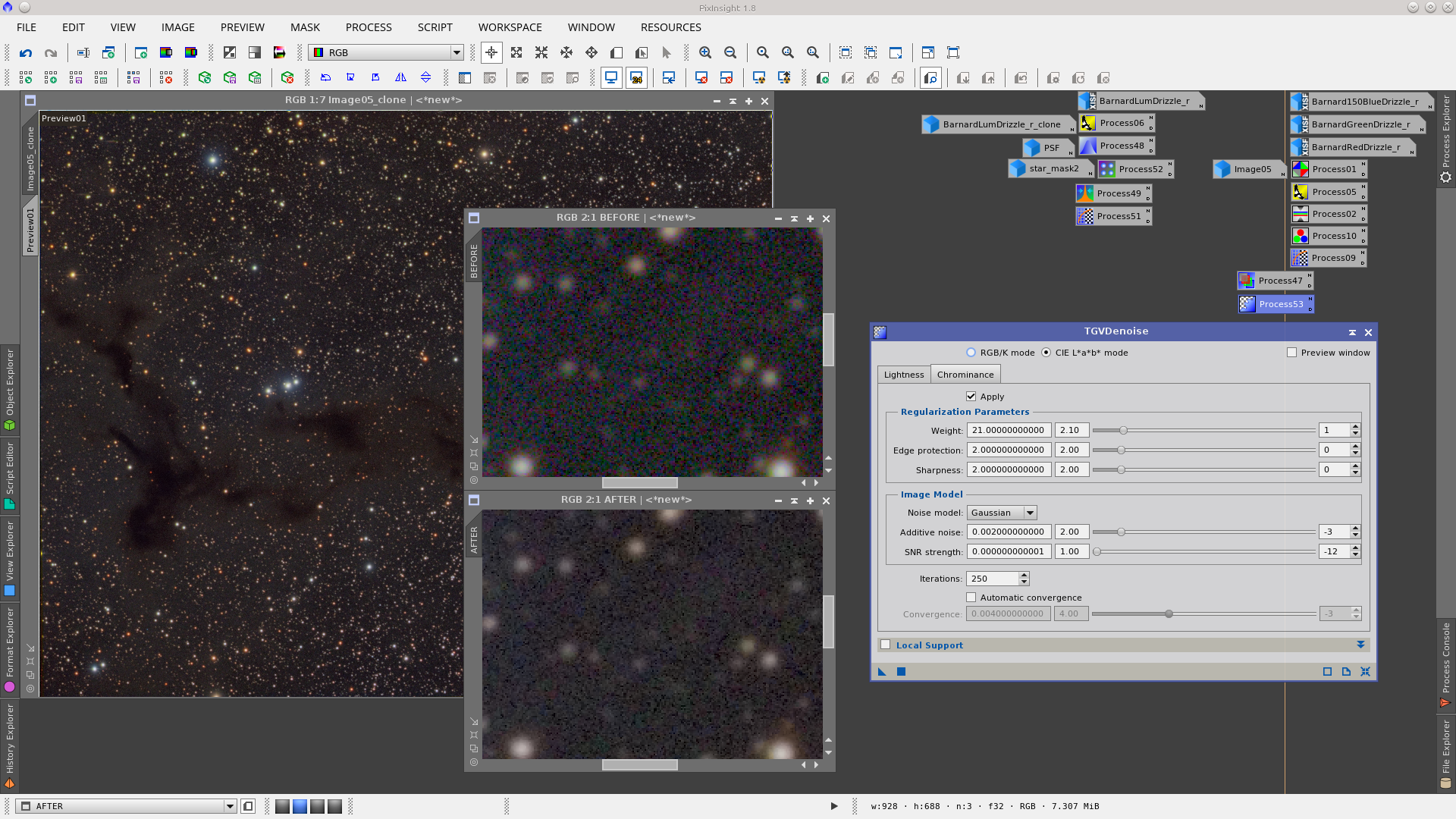 As the Saturation performed during the LRGB combiantion added noise in chrominance, I apply noise reduction using TGVDenoise only to chrominance.