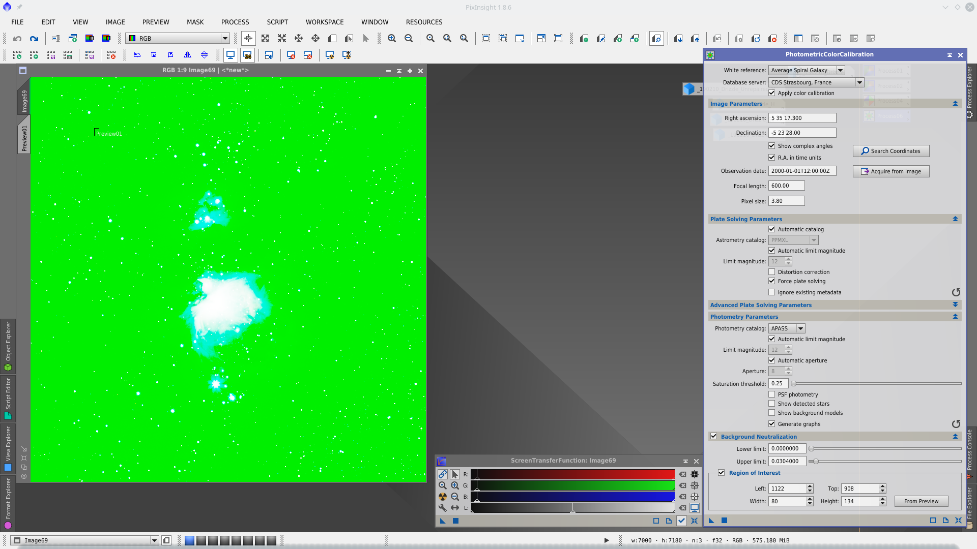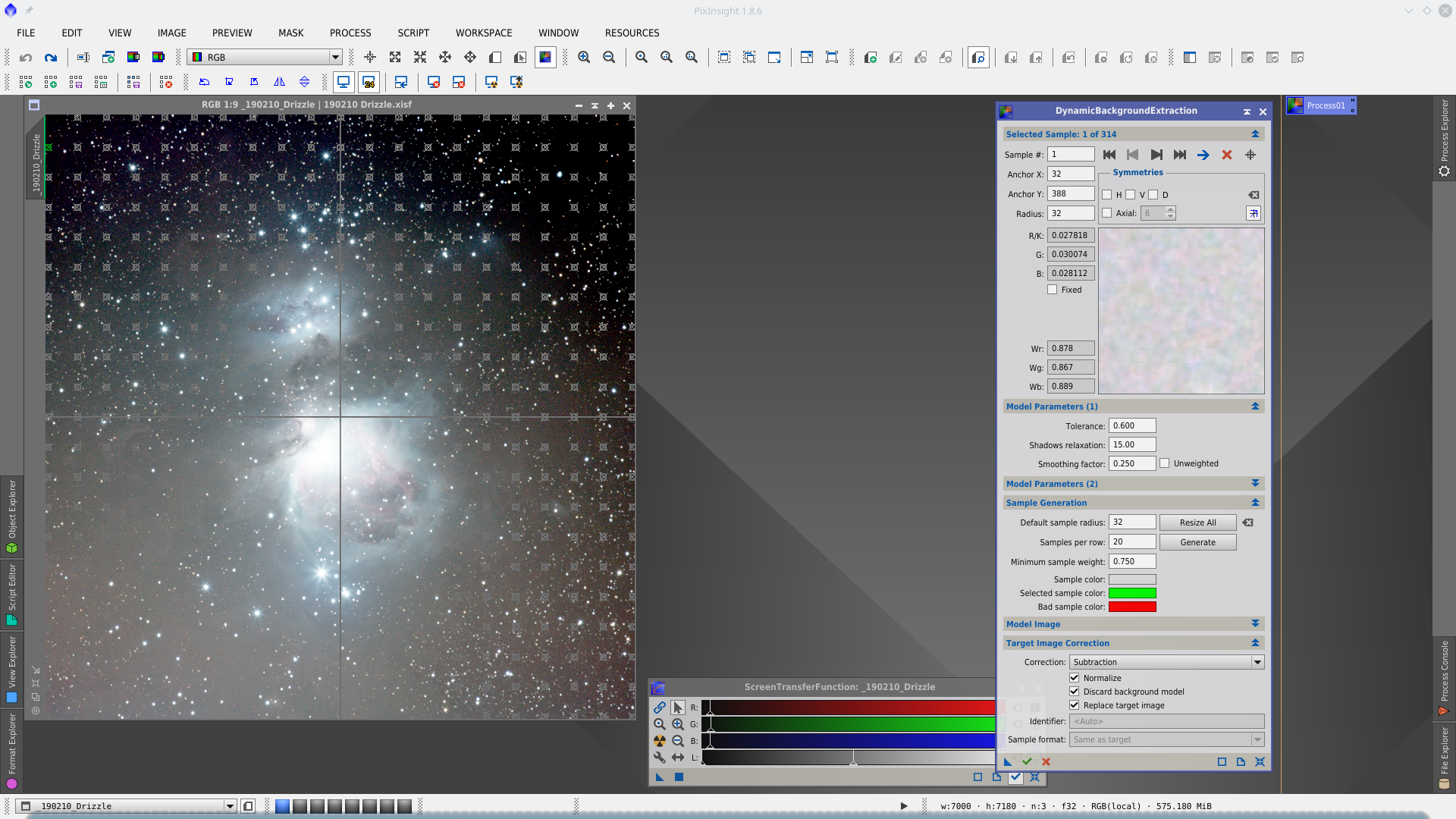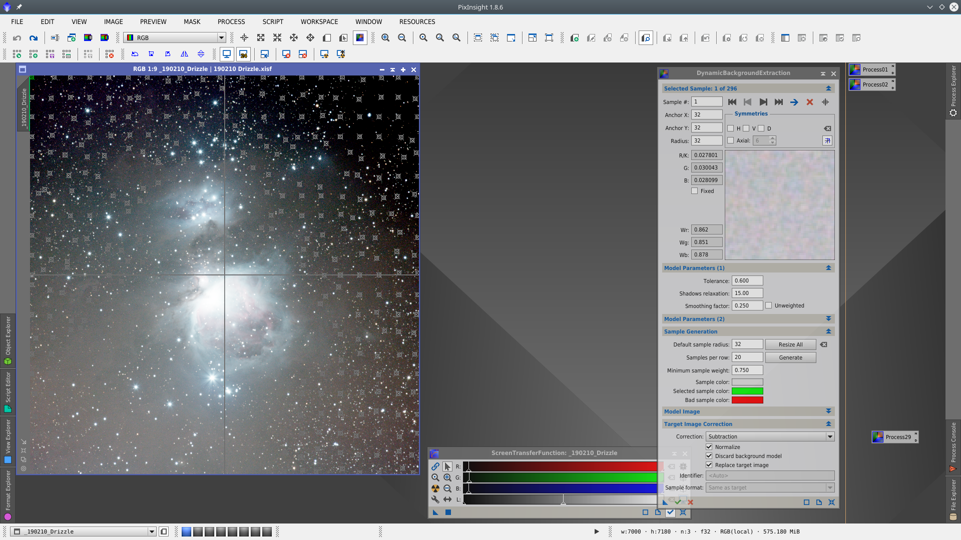 First I will apply DynamicBackgroundExtraction (DBE) to correct the background gradient of the image. To better visualitation of where to place the samples I apply a first DBE to obtain an auxiliar image that will use as reference to define the correct location of the samples.