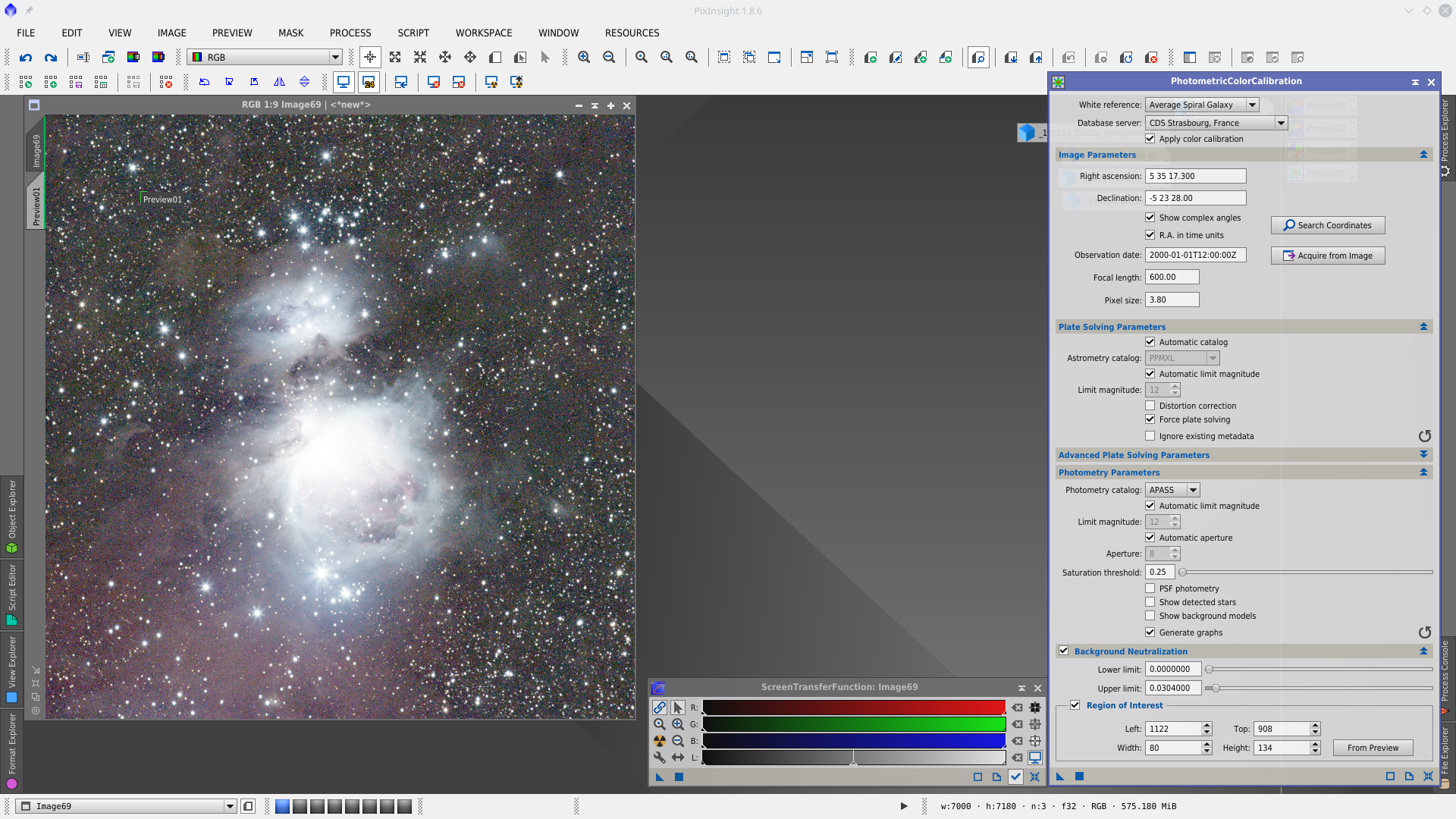 Color Calibration with PhotometricColorCalibration tool (PCC). This tool allows to solve the image, make the Color Calibration and Background Neutralization in the single step.