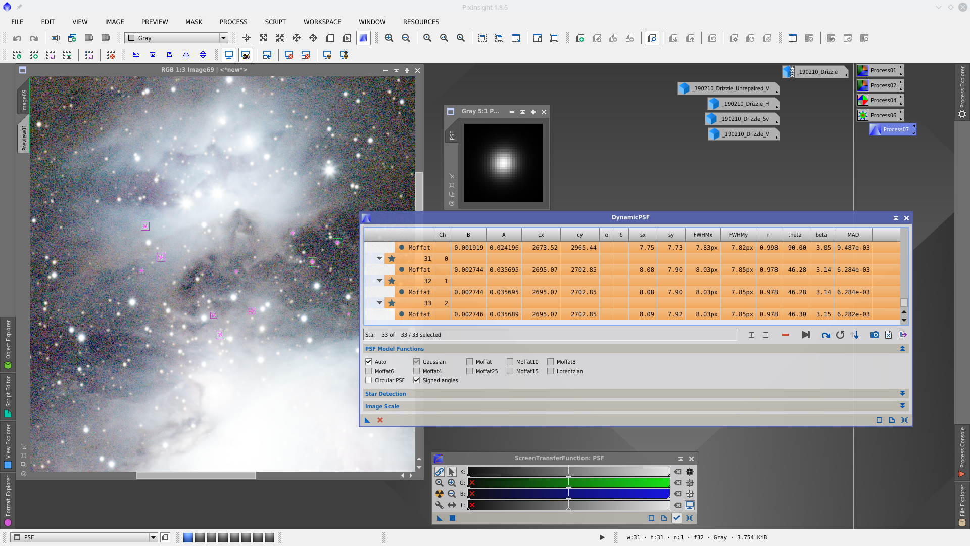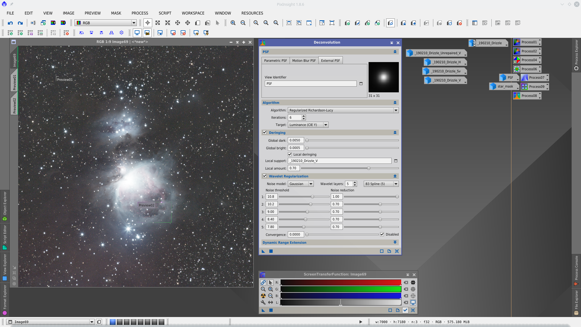 Next step is Deconvolution. With DynamicPSF tool choose reference stars in the center of the image and generate a PSF to be used in Deconvolution tool as external PSF model.