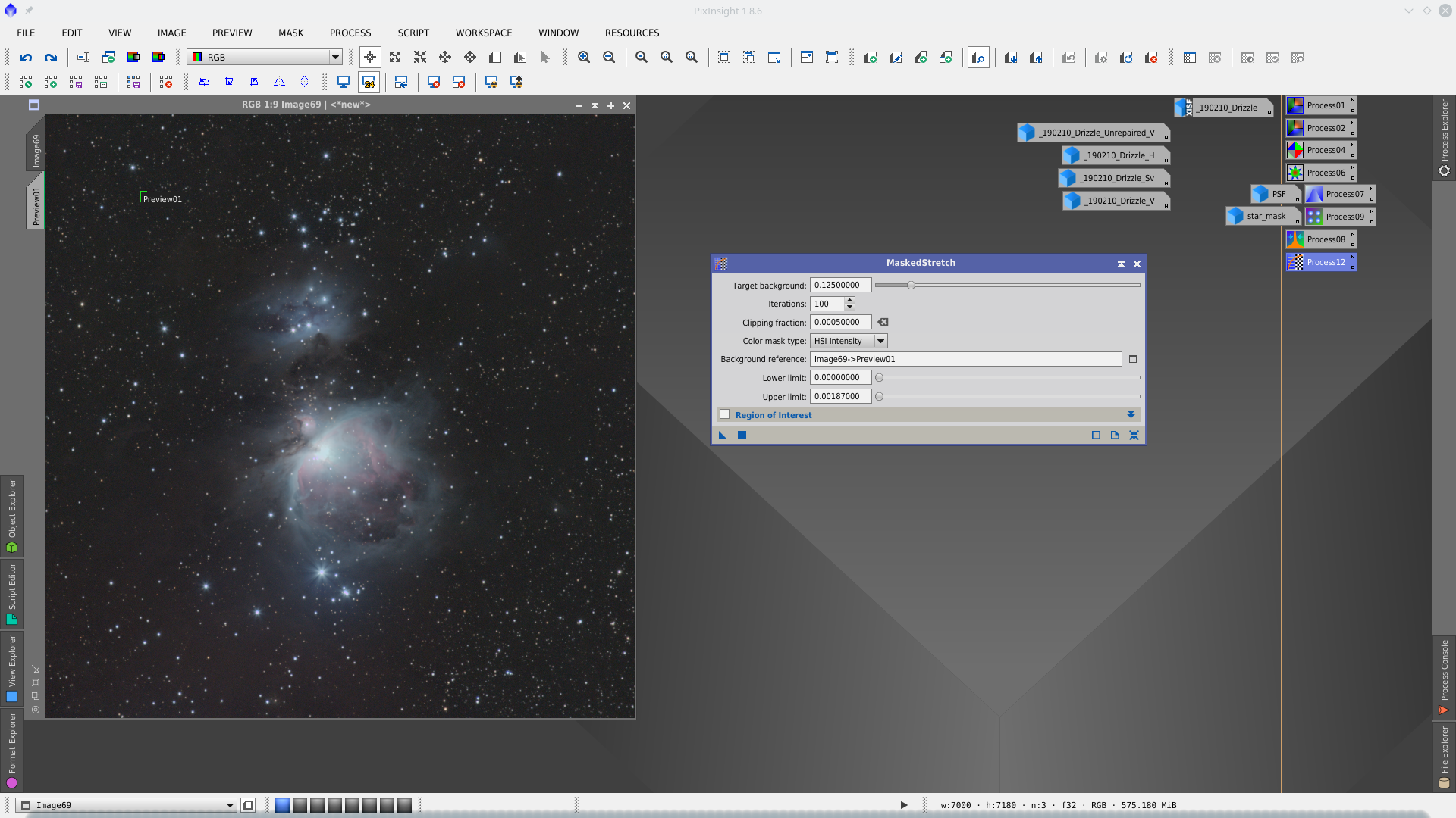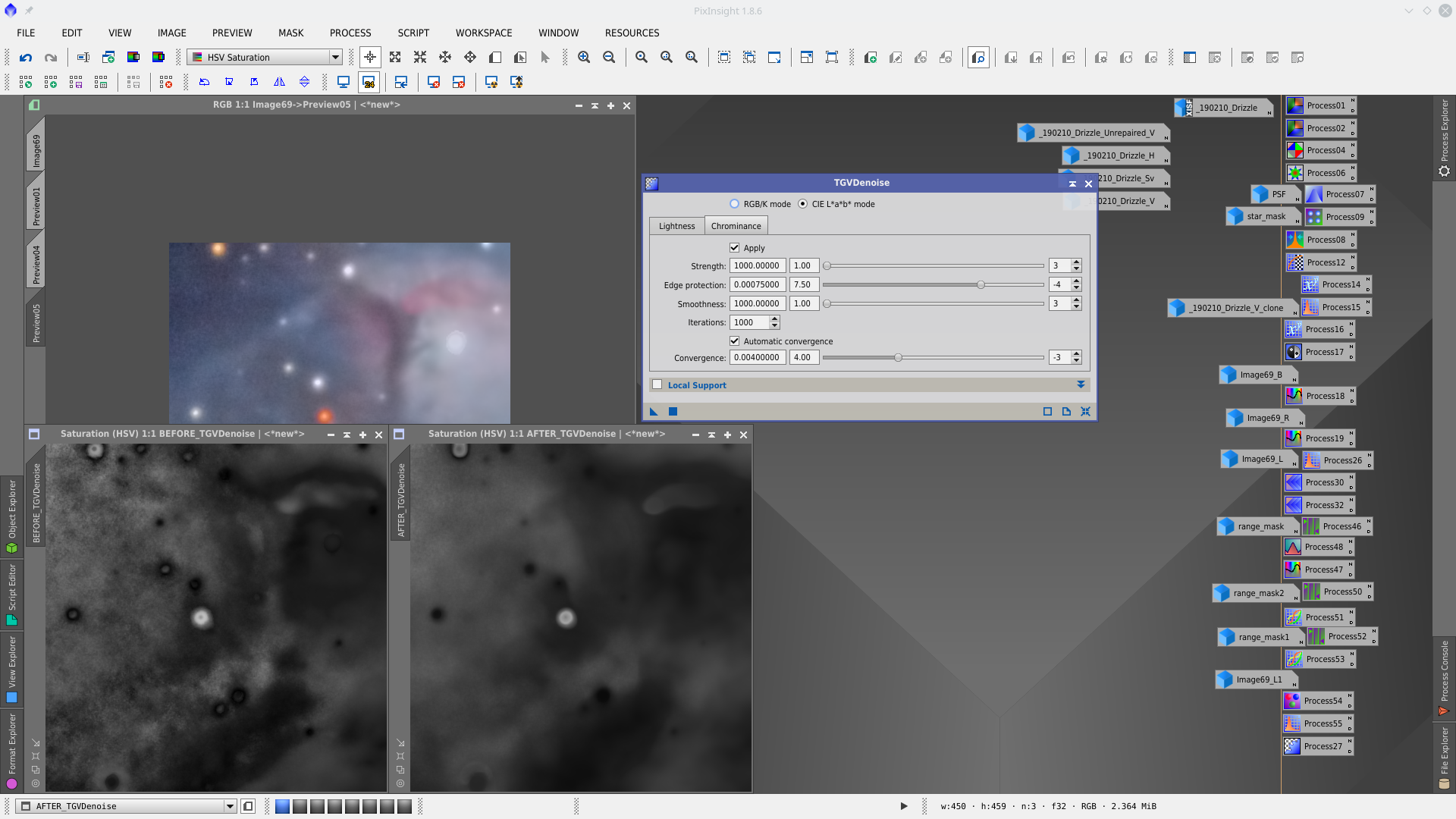 There is still some room to enhancing the nebulosity. For this first will reduce again chrominance noise using TGVDenoise tool. Applied without mask