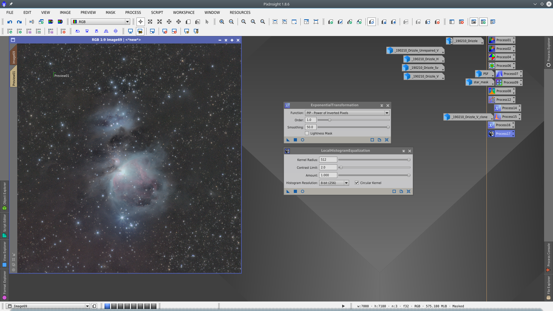 With the mask enabled protecting the nebulae, apply consecutively ExponentialTransformation and LocalHistogramEqualization to the image