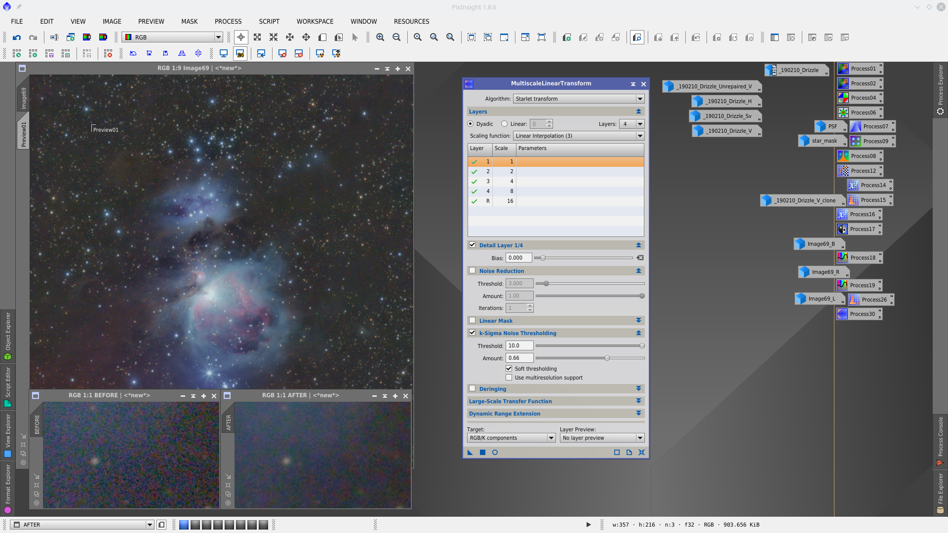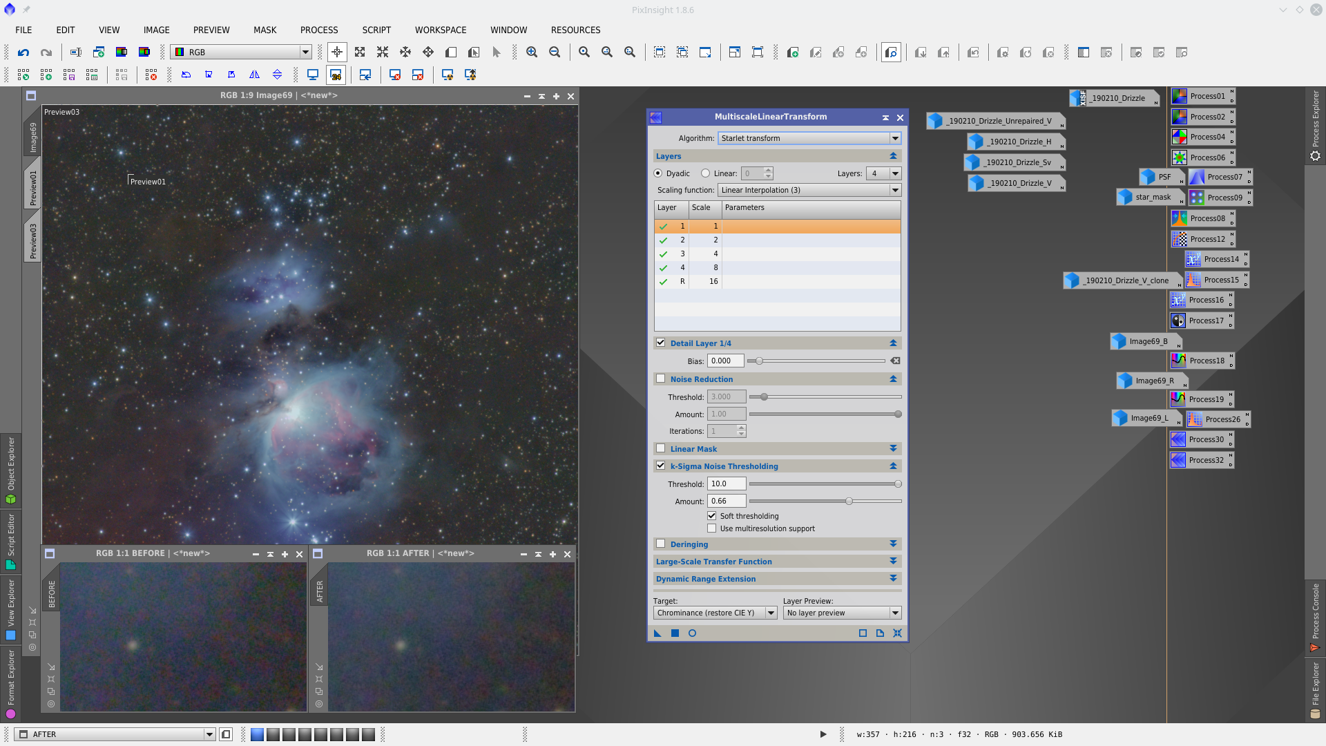 Noise reduction with MultiscaleLinearTransformation, first to RGB with mask and second to Chrominance without mask.